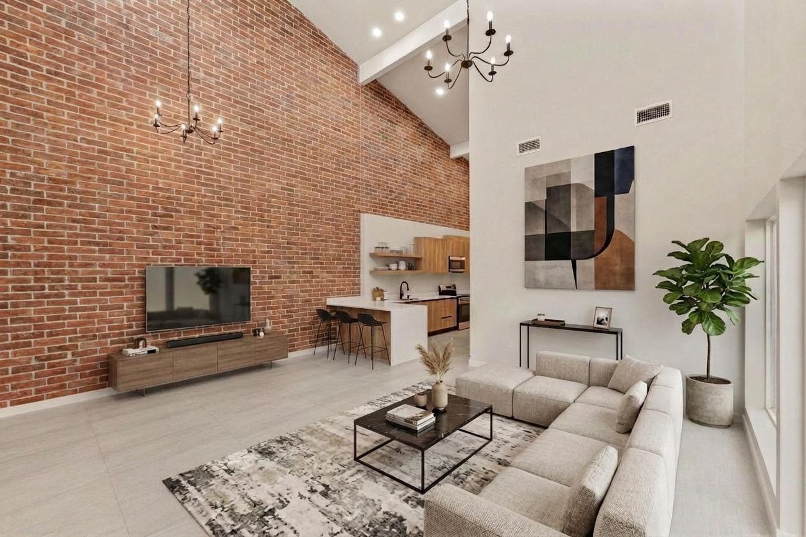 Inside, the common living areas impress with soaring double-height ceilings, creating an airy, open atmosphere filled with natural light. A stunning floor-to-ceiling brick accent wall anchors the space, adding warmth, texture, and a timeless architectural statement that sets these homes apart.