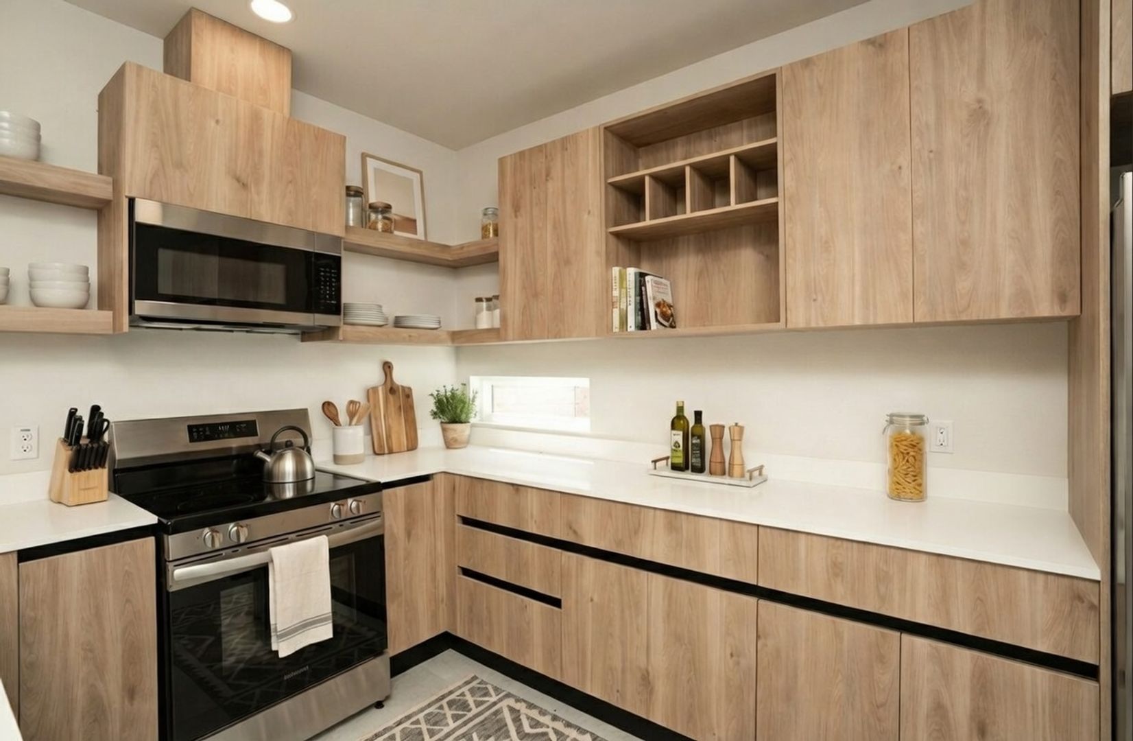 La cocina incluye electrodomésticos de acero inoxidable — refrigerador, estufa, lavavajillas y microondas — además de amplio espacio de almacenamiento. En la planta alta se encuentra la recámara principal con baño privado, dos recámaras adicionales y lavadora y secadora incluidas.